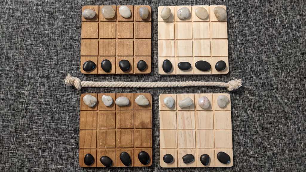 Shobu is played on four 4×4 grids, two stained light and two dark. Each player gets four stones on each board. A rope divides the center of the play area. Every turn you get two moves: one passive and one aggressive. The passive move must be on your side of the rope, and the stone you move (up to 2 spaces in any direction) cannot jump over or push another stone. The aggressive move must be made on an opposite-stained board, and it must be the same direction and distance as the passive move. This one can push other stones, and whoever pushes all of their opponents stones off of one of the four boards wins. Think about it for a second and you’ll begin to understand how tricky this can get.